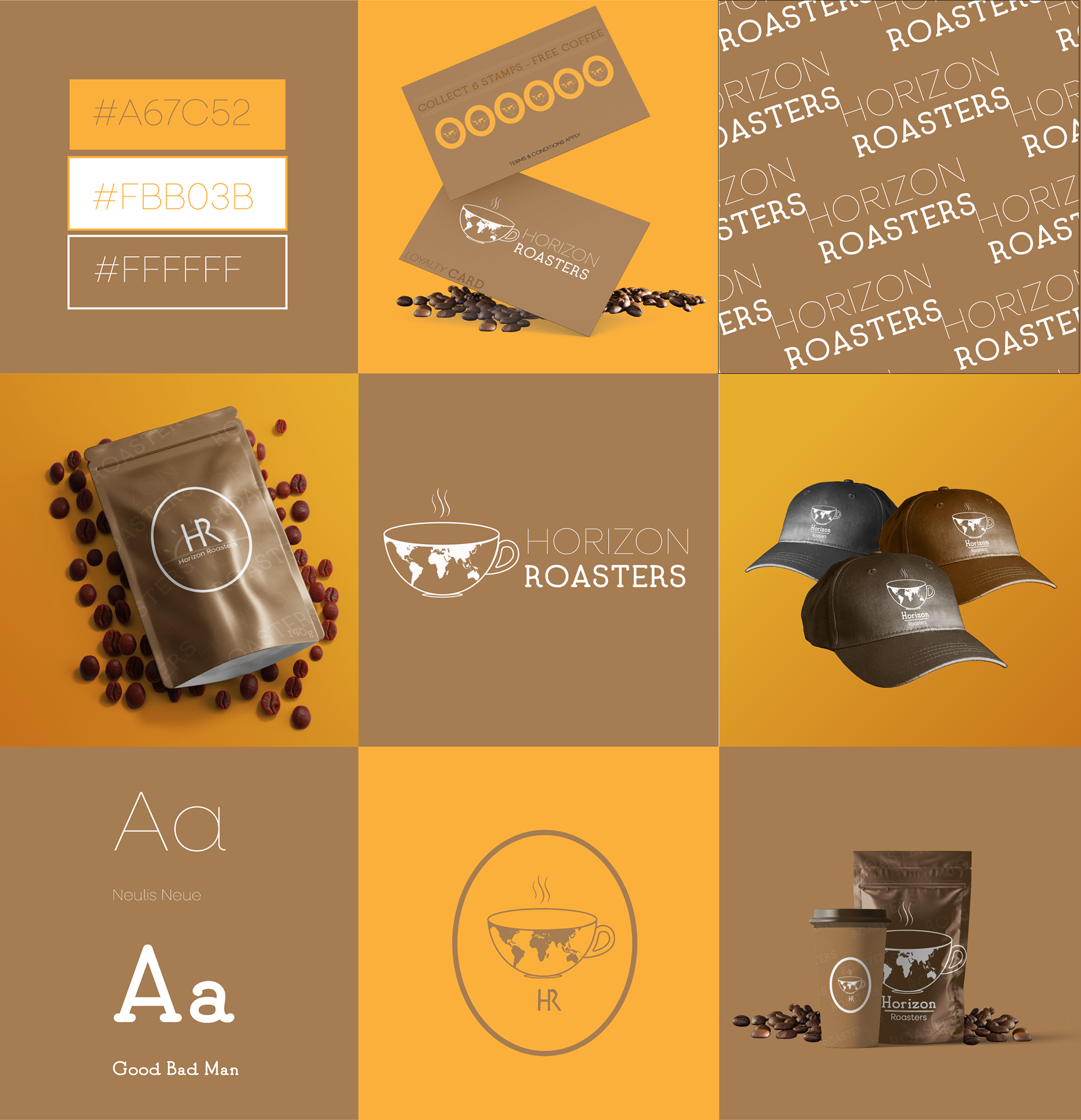 • Brand colour palette (earthy tones: #A67C52, #FBB03B, #FFFFFF)